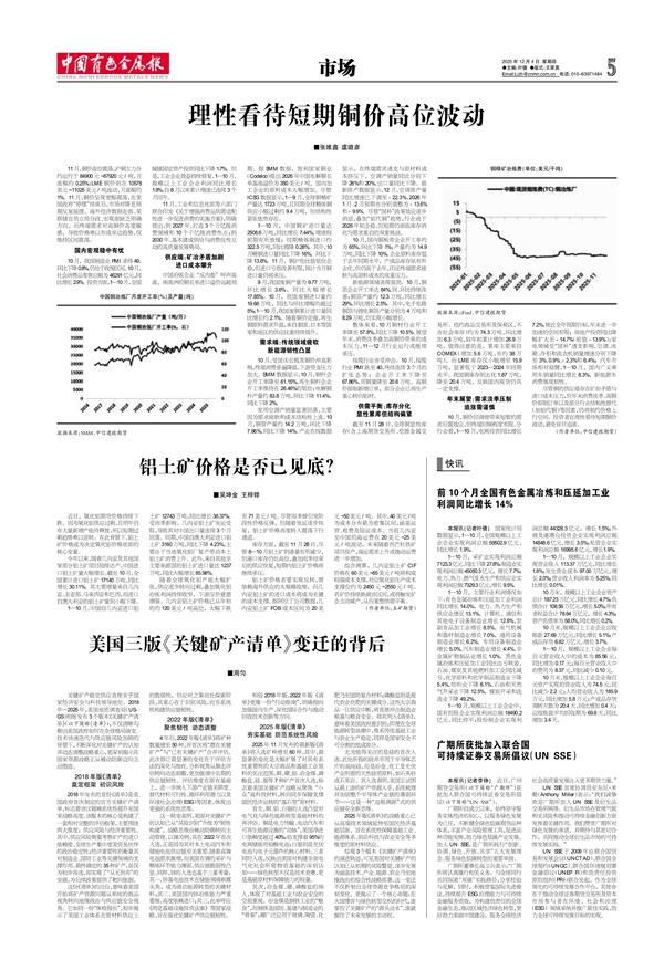 前10个月全国有色金属冶炼和压延加工业利润同比增长14%